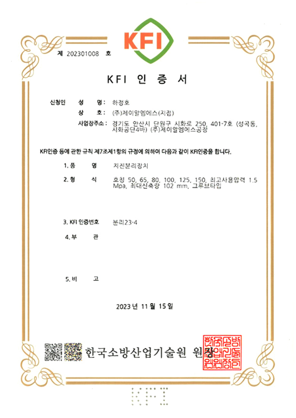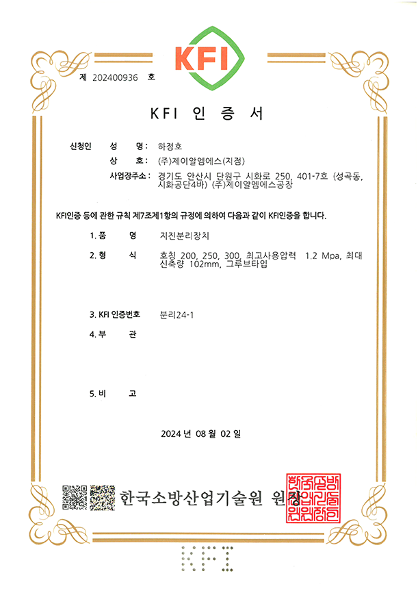 - 변위량 ±25mm~±610mm의 변위까지 사용 최고압력 20K로 인증되었다.(국내 최고 압력 및 변위량)